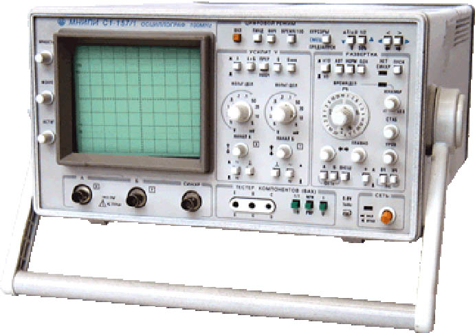Измерение осуществляется в полосе частот от 0 до 100 МГц по шкале экрана электронно-лучевой трубки (ЭЛТ), наблюдения периодических и однократных электрических сигналов и измерения их параметров при помощи курсоров в полосе частот от 0 до 10 МГц в цифровом режиме, а также для измерения параметров двух- и трехполюсников при помощи тестера компонентов. В цифровом режиме индикация режимов работы и измеренных значений осуществляется на экране. • Рабочая часть экрана — 80х100 мм; • калибратор: прямоугольные импульсы типа «меандр» частотой 1 кГц, амплитудой 0,6 В (погрешность ±1 %); • вертикальное отклонение; • число каналов — 2; • коэффициенты отклонения каналов от 5 мВ/дел до 5 В/дел; • основная погрешность коэффициентов отклонения ±3 %; • режимы работы: канал А , канал Б, суммирование каналов, поочередная или прерывистая коммутация, изменение полярности сигнала в канале Б; • горизонтальное отклонение; • коэффициенты развертки от 0,02 мкс/дел до 200 мс/дел (с возможностью их 10-кратной растяжки); • основная погрешность коэффициентов развертки ±4 %; • синхронизация; • источник канал А, канал Б, внешний вход, от сети; • вход внешней синхронизации (1±0,1) МОм/50 пФ, макс амплитуда 10 В; • режим Х-Y; • чувствительность от 5 мВ/дел до 5 В/дел; • полоса пропускания от 20 Гц до 3 МГц; • потребляемая мощность 90 В А; • масса 12 кг.