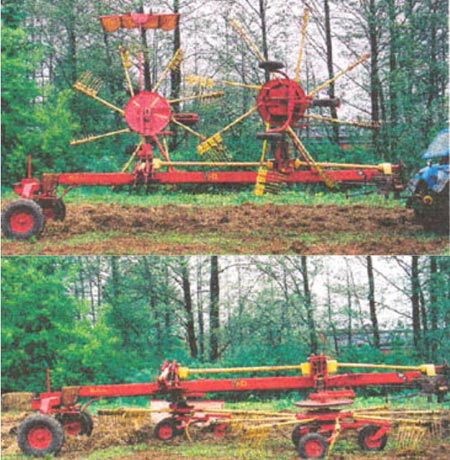 Предназначен для сгребания провяленной или свежескошенной травы из прокосов, в один валок, в один сдвоенный валок при челночном ходе и оборачивания валков. • Производительность при сдваивании валков, га: — за час основного времени — до 8,2; за час — эксплуатационного времени — 5,9; • ширина захвата 6,2— 6,9 м; • масса не более 1990 кг; • агрегатирование — трактор кл.1,4.
