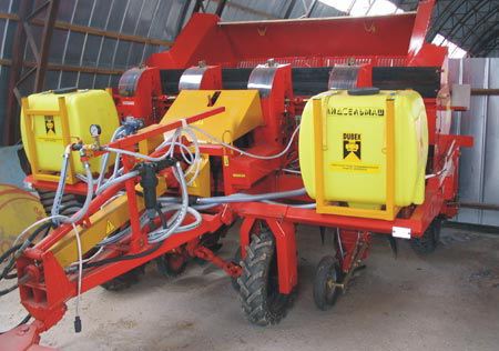 Предназначена для рядковой посадки с одновременным протравливанием непророщенных клубней картофеля на всех типах почв. Технические характеристики: • агрегатируется — трактор класса 1,4 • производительность за час основного времени: — на междурядьях 70 см — 1,0-2,0 га/ч — на междурядьях 90 см — 1,3-2,6 га/ч • количество высаживаемых рядков — 4; • ширина междурядий — 70, 90 см; • емкость бункера для картофеля — 2500 кг; • суммарная емкость баков для протравителя — 500 дм3; • масса машины — 2400 кг;° • срок службы — 10 лет.