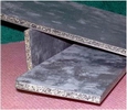 Листовой металлопластик изготавливается методом термопрессования. Материал содержит внутренний полимерный композиционный слой, который состоит полностью или частично из вторичных термопластичных полимеров. Полимер на 20—50 мас.% наполнен дисперсными и/или волокнистыми отходами растительного происхождения либо синтетическими или неорганическими волокнами. Внутренний полимерный слой по двум наружным поверхностям армируется металлическим листом толщиной от 0,25 до 3 мм. Для повышения прочности соединения слоев использован метод кратковременной высокотемпературной обработки тонкого слоя полимера на поверхности металла под действием l/IK-излучения, а применение в конструкции металлических листов с односторонними сквозными коническими отверстиями с загнутыми заусенцами обеспечивает дополнительную прочность соединения слоев за счет заполнения внутреннего объ-. ема конических отверстий полимерным композитом. Комбинация этих двух методов увеличивает адгезионную прочность при расслаивании в 3—4 раза по сравнению с прочностью соединения неактивированных слоев листовых материалов. Характеристики металлопластика на основе термопластичного композиционного материала с волокнистыми отходами растительного происхождения (до 40 мас.%), армированного с двух сторон листовой оцинкованной сталью толщиной 0,55 мм Характеристики: • толщина — 3— 10 мм; • плотность— 2,4— 2,8 г/см3; • разрушающее напряжение при растяжении — 120—180 МПа; • разрушающее напряжение при изгибе — 400— 600 МПа; • модуль упругости при изгибе —10— 22 ГПа.