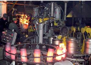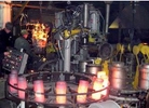 Технологический процесс создан на базе метода непрерывно-циклического литья намораживанием (НЦЛН). В его основу положен принцип направленного затвердевания, при котором отливка формируется в условиях интенсивного теплоотвода в водоохлаждаемый кристаллизатор, а ее внутренняя поверхность образуется при непосредственном взаимодействии с расплавом Процесс литья включает заполнение стального водоохлаждаемого кристаллизатора расплавленным металлом снизу, выдержку для формирования отливки и ее извлечение из кристаллизатора вверх с одновременным доливанием новой порции расплава. Подача металла в кристаллизатор производится с использованием разового металлопровода, футерованного огнеупорным материалом. Процесс выполняется в непрерывно-циклическом режиме, темп которого задается скоростью затвердевания в кристаллизаторе отливки требуемой толщины. Совмещение в единый процесс литья и термообработки обеспечивает формирование отливок с заданными структурой и свойствами без дополнительных затрат энергии. • размер заготовок, мм: — наружный диаметр — 140; — толщина стенки — 18; — высота — 270 • структура: — матрица: в наружном (4— 5 мм) слое — перлитоферритная (П60-П85; НВ 217-237), в зоне рабочей поверхности гильзы — перлитная (П96-П; Пд0,5-Пд1,0; НВ 229-255); — графит: в наружной (до 2— 4 мм) зоне литых заготовок в виде точечных или мелкопластинчатых включений (ПГр8, ПГд15, ПГ8 ), во внутренних слоях — равномерно распределенный тонкопластинчатый прямолинейной и завихренной формы ПГр1; (ПГр8), ПГд45-ПГд90, ПГ8-ПГ10. • литейное оборудование: — масса полуавтоматической литейной установки — 4,5 т — производственная площадь литейного участка — 60 м2 — производительность — 100— 150 отливок/ч — выход годного — 90— 95 '%