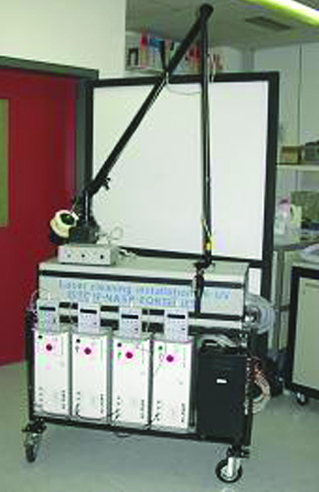 С целью повышения качества очистки установка позволяет одновременно воздействовать на очищаемую поверхность наносекундным излучением основной частоты мощного лазера на АИГ:Nd и одной из его гармоник. Лазерное излучение подводится к обрабатываемой поверхности с помощью 7-зеркального шарнирного манипулятора общей длиной 2 м, на конце которого имеется рабочий орган с формирователем излучения на поверхности обрабатываемого художественного произведения. Установка имеет специальный механизм, обеспечивающий получение оптимального для каждого типа художественного произведения соотношения интенсивностей УФ и ИК компонент. Установка имеет блочную конструкцию с надежной виброизоляцией всех блоков и узлов, что обеспечивает высокую надежность при транспортировании и работе. Разработанные технологии и установка не имеют аналогов в СНГ, а по ряду параметров превосходят зарубежные аналоги. Характеристики: • Энергия излучения на выходе: — на 1064 нм до 550 мДж; — на 532 нм до 800 мДж; — на 355 нм до 400 мДж; — на 266 нм до 300 мДж; — на 213 нм до 100 мДж; • длительность импульса излучения —15—20 нс; • частота следования импульсов — 1—5 Гц.