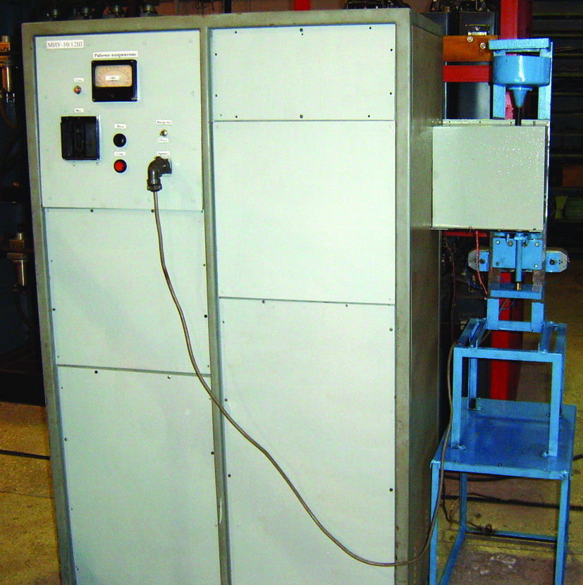 Оборудование и специальный инструмент для упрочняющей обработки представляет собой магнитно-импульсную установку, состоящую из генератора импульсных токов, блока управления, и индуктора, выполняющего функцию инструмента для упрочняющей обработки изделий. Разработано устройство для автоматизированной подачи шариков диаметром 3/8” в зону упрочнения; устройство соединено с индуктором. Оборудование имеет следующие характеристики: • прочность шариков (усилие разрушения) после упрочняющей обработки не ниже 80 кН; • напряжение питающей сети — 220 В; • рабочее напряжение — 7 кВ; • мощность —— 5 кВт; • производительность —— 1000—4000 шт./ч (шариков 3/8//) • габариты оборудования — 1500x800x1800 мм. В результате отладки мощность электроразрядного импульса составляет 2,0 кДж, количество импульсов — от 1 до 4 в минуту, подача шариков в зону упрочнения в индукторе полностью синхронизирована с подачей импульсов, управление работой оборудования автоматизировано.
