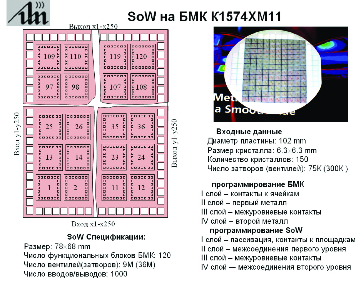 Разработанная минифабрика заказных интегральных микросхем и систем на пластинах (minifab ASICs and SoW) ориентирована на заказные приборы: ASIC, SoC, SoW, и IP-blocks. Основные принципы минифабрики: • неполный цикл — формирование только межсоединений; • индивидуальная обработка пластин: каждая пластина — производственная партия; • прямая лазерная запись элементов межсоединений; • минимальный размер суперчистой комнаты; • автоматизированное оборудование; • оборудование объединено в единую конвейерную линию. Преимущества минифабрики: • минимальное число и низкая стоимость единиц оборудования; • минимум обслуживающего персонала • короткий срок программирования (< 3 часов 1 слой); Лазерный генератор изображений, обеспечивает: — получение минимального размера элемента x 0.5 mm; — максимальную площадь экспонирования 300*300 mm2; — точность позиционирования луча < 0.1 mm; — индивидуальное программирование каждого кристалла на пластине; — сокращение времени и материальных затрат разработки и изготовления SoW и перехода от одного типа к другому; — отсутствие ограничения на размер экспонируемого кристалла; SoW, вплоть до x300 мм; — оперативное внесение изменений в изготавливаемое SoW; — отключение неисправных элементов и подключение резервных вплоть до отдельной ячейки.