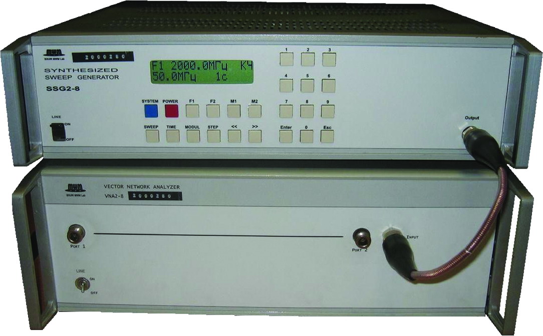 Измеритель предназначен для автоматизированного измерения комплексных коэффициентов передачи и отражения (S-параметров) коаксиальных устройств, имеющих коаксиальный тракт 7—3 мм, с цифровым отсчетом измеряемых величин и воспроизведением их частотных характеристик в декартовой или полярной системе координат на экране ЭВМ, входящей в состав измерителя. Объектами измерения (ОИ) могут быть устройства оконечного (ДП) и проходного (ЧП) типов. Измеритель также позволяет измерять ГВЗ, вычисляемое по известному алгоритму на основании результатов измерений S-параметров. Измеритель может быть использован в качестве самостоятельного прибора для проверки и настройки СВЧ аппаратуры в условиях цехов, лабораторий, а также в составе автоматизированных систем при работе с управлением от ЭВМ через канал общего пользования. Комплект обеспечивает адекватную цифровую обработку всей измерительной информации в соответствии с алгоритмами функционирования измерителя во всех режимах работы. Измеритель состоит из генератора сигналов качающейся частоты и блока обработки измерительной информации с конструктивно встроенным в него СВЧ измерительного тракта и ЭВМ с интерфейсом КОП. Управление работой измерителя, осуществляется с клавиатуры ЭВМ в диалоговом режиме. Электрические параметры и характеристики: • рабочий диапазон частот измерителя от 2,0 до 8,0 ГГц; • запас по краям диапазона не менее 1 % от значений номинальных граничных частот; • полоса качания частоты измерителя от 2,0 до 8,0 ГГц; • количество частотных точек, в которых производится измерение S параметров и ГВЗ, равно 499 и не зависит от выбранной полосы качания частоты; • измеритель обеспечивает автоматическую перестройку частоты во всём частотном диапазоне с длительностью перестройки 0,08 с и 1 с. • напряжение сети 220 x 22 В частота 50 x 1,0 Гц и содержанием гармоник не более 5 %.