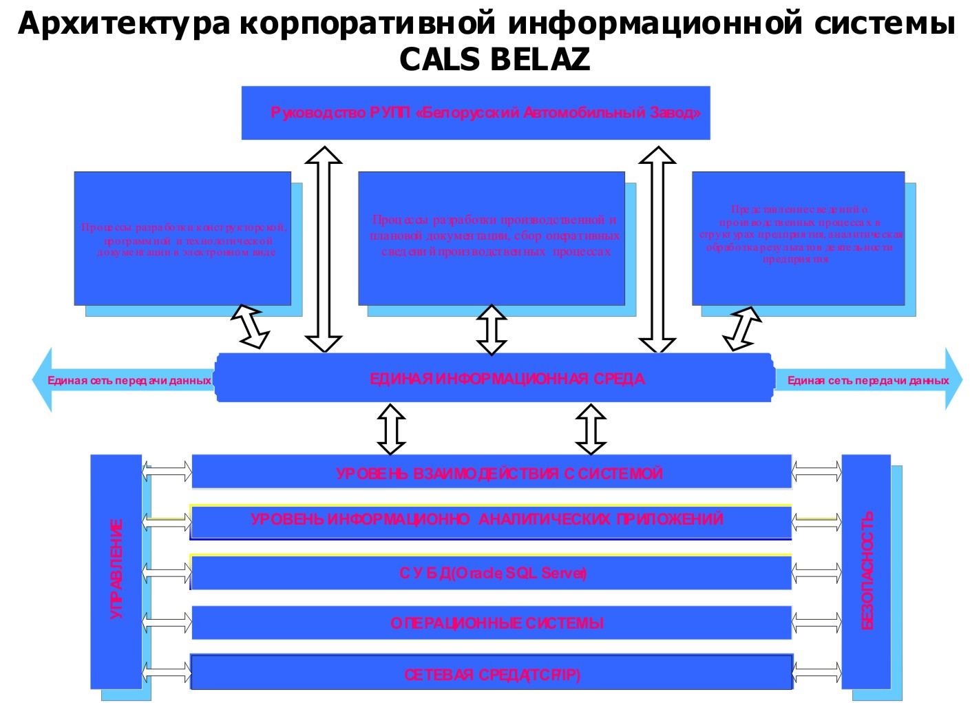 Основным назначением CALS технологий является обеспечение деятельности предприятия в режиме безбумажных информационных потоков в течение всего жизненного цикла продукции. Основные принципы, на базе которых строится корпоративная информационная система CALS- BELAZ, состоят в следующем: • использование единой информационной среды как средства интеграции для информационного взаимодействия внутри системы; • стандартизация представления информации в электронном виде (электронный документ – внутренний стандарт системы); • осуществление взаимодействия на унифицированной основе; • использование единой сети передачи данных. В состав системы входят автоматизированные системы конструкторско-технологической подготовки производства, управления производством, контроля качества, инфраструктуры открытых ключей для организации электронной цифровой подписи, комплексы, организующие оборот и хранение электронных документов, интегрирующий комплекс для объединения гетерогенных приложений. Все информационные взаимодействия в системе происходят с использованием XML представления.