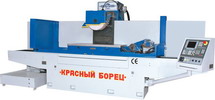 Профилирование шлифовального круга осуществляется специальным приспособлением путем вращения алмазного ролика и перемещения шлифовальной головки по координатам Y и Z по программе от системы ЧПУ. Особенности конструкции: – колонна перемещается по линейным направляющим STAR фирмы REXROTH; – направляющие скольжения стола с полимерным покрытием; – закалённые стальные направляющие перемещения шлифовальной головки на роликовых опорах качения; – перемещение стола от гидроцилиндра; – автоматическая смазка продольных и вертикальных направляющих; – cистема ЧПУ SINUMERIK 802 C / 802 D; – обратная связь с помощью фотоимпульсных преобразователей фирмы HEIDENHAIN; – шариковые винтовые пары для поперечного и вертикального перемещения. Основные технические характеристики: • размеры зеркала стола (BxL), мм 600х1500; • пределы рабочих подач: – продольное перемещение стола (ось х), 2…28м/мин; – вертикальное перемещение шлифовальной головки (ось z), 0,001…0,3 мм/ход; – поперечное перемещение (ось Y), 0,3…20 мм/ход; • наибольшие размеры обрабатываемых поверхностей 1500х600мм; • наибольшая масса устанавливаемой заготовки (вместе с приспособлением или электромагнитной плитой) - 1200 кг; • управляемое количество координат 3; • наибольшее расстояние от зеркала стола до оси шпинделя - 800 мм; • размеры шлифовального круга (DxHxd) 400х100х127 мм; • мощность главного привода, 11 кВт; • габаритные размеры 4800х4000х2250мм; • масса - 8900 кг.