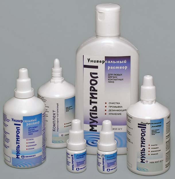 «Мультирол-I» предназначен для антисептической обработки, очистки, хранения мягких контактных линз. «Мультирол-II» предназначен для ухода за всеми типами контактных линз. «Комплект пероксидно-катализный» используется для дезинфекции, очистки и хранения контактных линз. «Мультирол-К» - капли глазные, предназначенные для обеспечения комфортности пациентов при использовании контактных линз различных типов, регидратации - увлажнения контактных линз. «Мультирол-Э» предназначен для ухода за всеми типами контактных линз, имеющих белковые и другие виды загрязнений. Разработан состав очистителя ферментного для всех типов контактных линз, включающий химотрипсин, трипсин, натрий тетраборнокислый, др. компоненты. Препарат сохраняет 95 % активности при хранении в течение 4 месяцев, различия в количестве белков не превышают 5 – 10 % для различных пар линз.