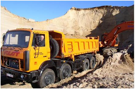 Самосвальный автопоезд с боковой разгрузкой в составе автомобиля-самосвала 8х4 и самосвального прицепа предназначен для перевозки сыпучих и других строительных материалов. Может эксплуатироваться на всех видах дорог с заездом на строительную площадку или карьеры, обустроенные подъездными путями. Данный автопоезд обеспечивает перевозку допустимой массы перевозимого груза 21450 кг одиночным самосвалом и 42450 кг в составе автопоезда с трёхосным прицепом типа САТ-135.