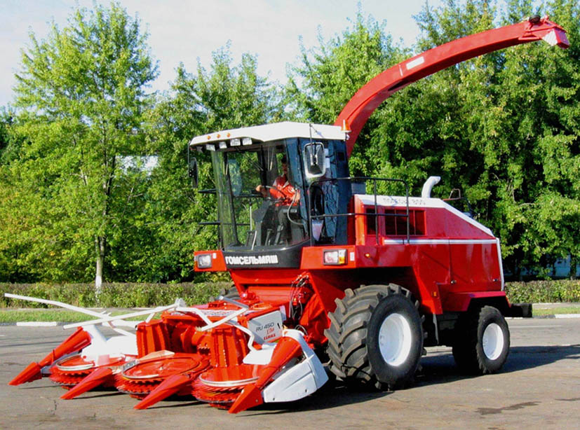 Комплекс оснащен современными устройствами: — автоматизированная заточка ножей, осуществляемая на прямом ходу измельчающего барабана специальным заточным устройством; — дистанционное, из кабины, выставление зазора между ножами и противорежущим брусом; — упрощенная конструкция ременной передачи и улучшенные условия ее работы; — при забивании питающего аппарата предусмотрен реверс от гидромотора; — сменный доизмельчитель зерен кукурузы, обеспечена возможность замены доизмельчителя на проставку для уборки трав; — выброс сменных дополнительных пассивных устройств для дробления зерен кукурузы и вентилятора, для отсоса пыли с поверхности вращающегося воздухозаборника двигателя; — система копирования адаптерами рельефа; — современная кабина с панорамным стеклом и климатической установкой, включающей в себя кондиционер, отопитель и холодильник, что повышает комфортность и улучшает условия работы механизатора; — двухсекционная конструкция подбирающего устройства подборщика с промежуточной опорой. Комплектуется: •жаткой для фубостебельных культур ЖГР-4,5-1 (4,5 м) или RU-450 (Германия); •подборщиком (Зм или 4,2 м); •жаткой для трав (5 м). • Производительность, т/ч: • на подборе трав — 100, • на уборке трав — 100, • на уборке кукурузы молочно-восковой спелости — 150, • на уборке кукурузы восковой спелости — 100.