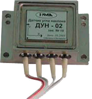 Датчик угла наклона включает в себя двухкоординатный МЭМС-акселерометр, датчик температуры, микропроцессорный блок, блок интерфейса. Датчик характеризуется высокой ударо- и вибропрочностью, пыле- и влагозащищенностью. • Количество осей чувствительности — 1 (ДУН01), 2 (ДУН02); • диапазон углов наклона — -900—+900 (ДУН01), -450—+450 (ДУН02); • основная погрешность не более 0,5%; • разрешение по углу наклона не более 0,10; • температурный дрейф нулевого уровня не более .0,01 0С; • рабочий диапазон температур — -40—+85 0С; • напряжение питания — 9—12 В; • мощность потребления не более 0,3 Вт; • габаритные размеры — 48х24х17 мм; • тип выходного сигнала цифровой RS232.