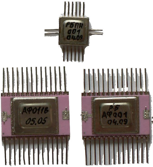 Микросборка РБ1С8АФ001 для электронно-счетных частотомеров превосходит отечественный образец АФ011В. • Входные сигналы выбора входа коммутатора и инвестирования сигнала усилителя-ограничителя при напряжении +5В: — логический «0» не более 0,2 В; — логическая «1» не менее 4,8 В. • Входные сигналы включения/выключения коммутатора при напряжении + 5В: — логический «0» не более 3,3 В; — логическая «1» не менее 4,1 В. • Выходные сигналы коммутатора при напряжении + 5В и нагрузке 300 Ом, соединенной с нулевым потенциалом: — логический «0» не менее 3,1 В и не более 3,4 В; — логическая «1» не менее 4,0 В и не более 4,3 В. Микросборка РБ1С8ПН001 для цифровых широкополосных вольтметров. Отечественных аналогов не имеет. • Выходное напряжение в зависимости от уровня входного напряжения постоянного тока мВ при: + 2,0 В — 1994—2006; + 1,0 В — 996—1004; + 0,5 В — 497—503; + 0,3 В — 297—303; • Выходное напряжение при преобразовании напряжения синусоидальной формы в зависимости от частоты, мВ, при =1 кГц: 2,0 В — 1994—2006; 1,0 В — 996—1004; 0,5 В — 497—503; 0,3 В — 297—303.